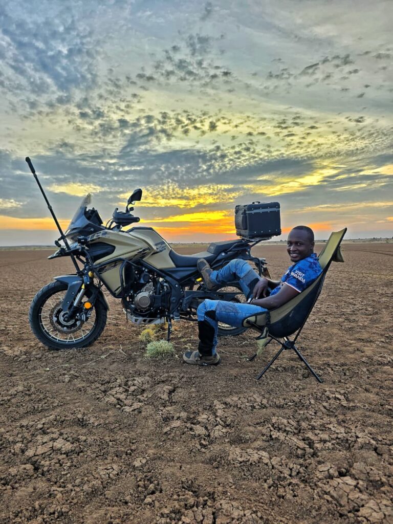 Weston on his adventure bike in Turkana. At dawn on a dusty highway in northern Kenya, the roar of